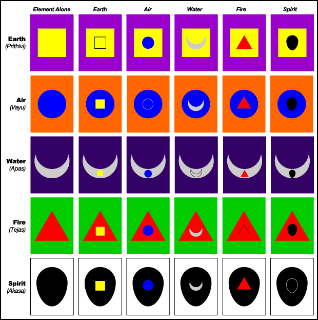 Ti su elementi svemir / nebo (Akasha), vatra (Tejas), vetar / vazduh (Vayu), mesec / voda (apas) i zemlja (Prithvi).